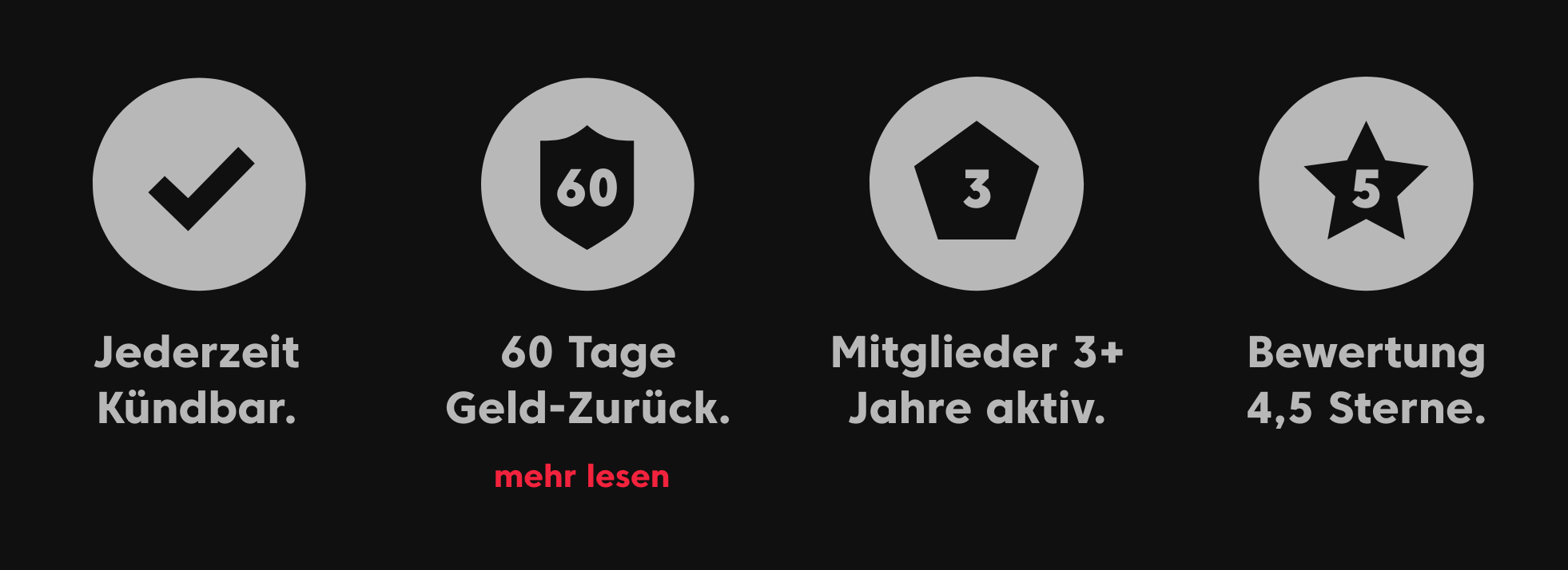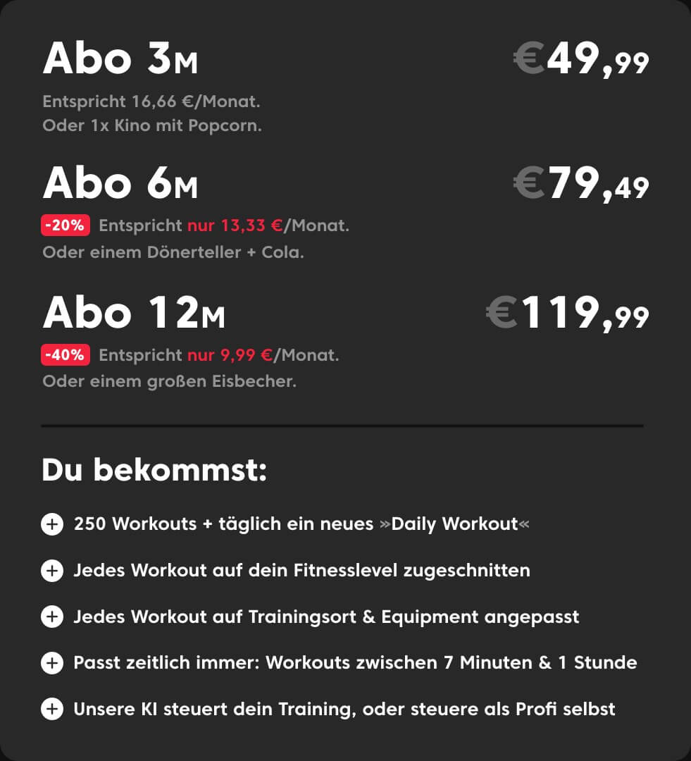 Ohne Mitgliedschaft kannst du 250+ Original-Workouts nutzen und an unserer motivierenden Community teilnehmen. Als Mitglied erhältst du zusätzlich jeden Tag ein neues »Daily Workout« + unsere KI passt alle Workouts auf deine Ausstattung und dein Fitnesslevel an. So kannst du jederzeit und überall ein »für dich« optimales Workout absolvieren.